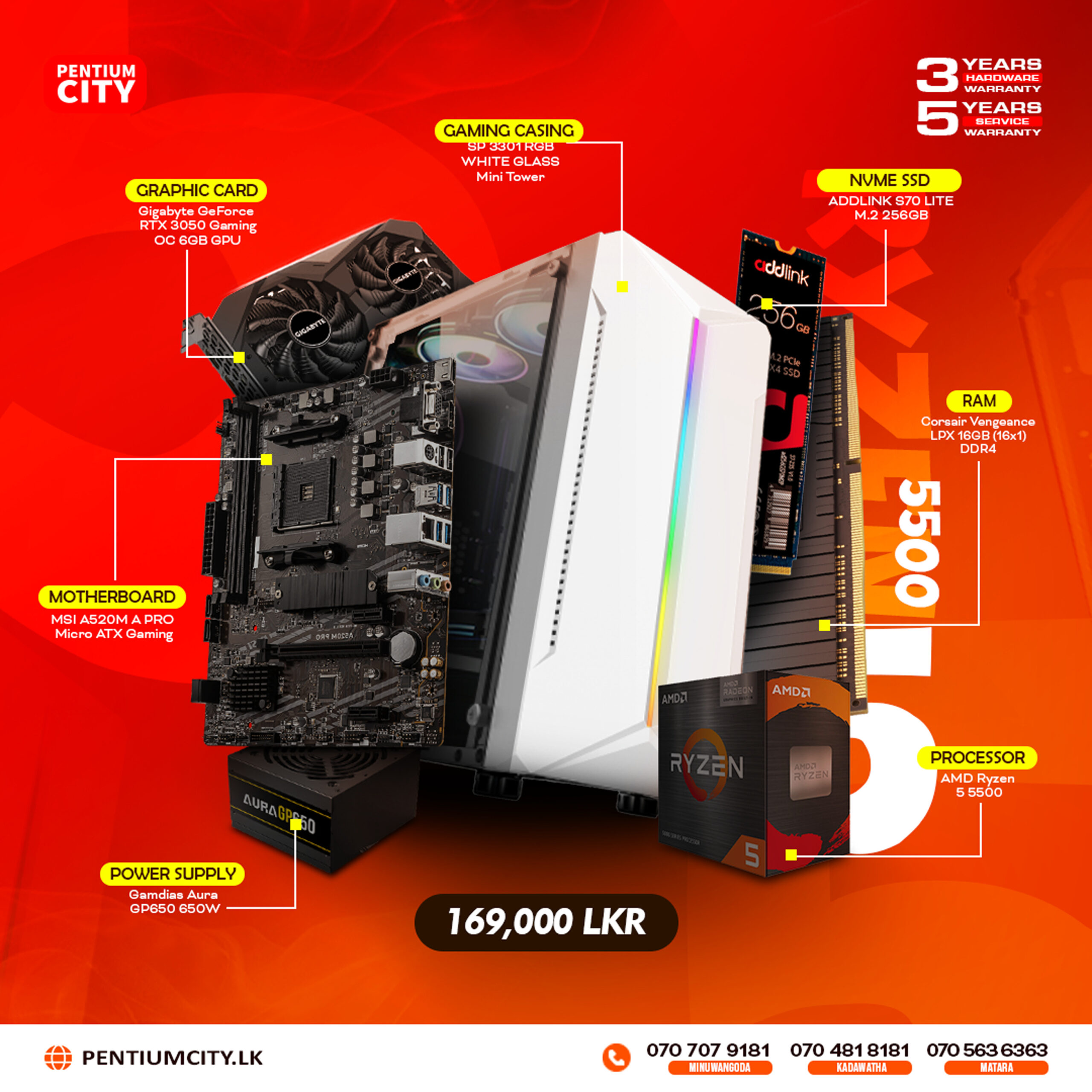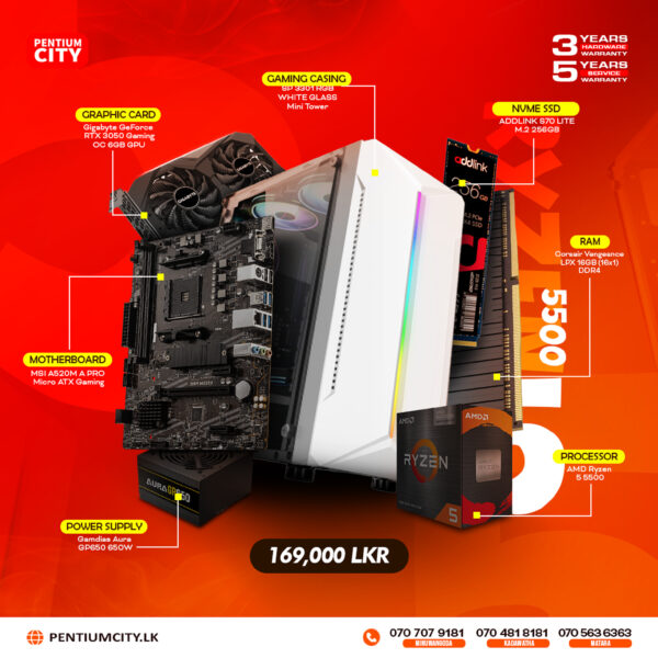 Powerful AMD Ryzen 5 5500 gaming PC featuring Corsair Vengeance LPX 8GB DDR4 RAM, MSI A520M-A PRO motherboard, MSI GTX 1650 4GB graphics card, 256GB NVMe SSD, and complete with genuine Windows key and Microsoft Office.