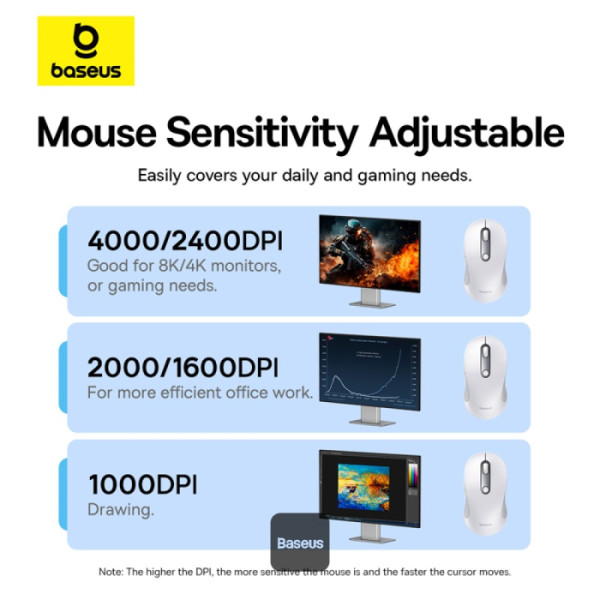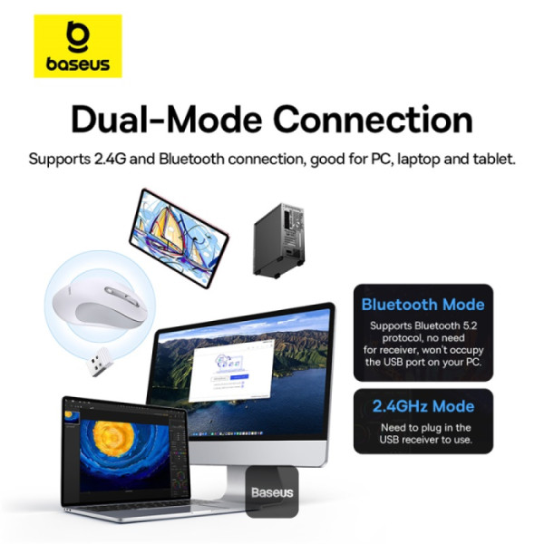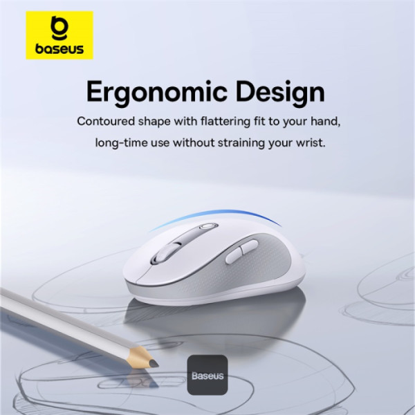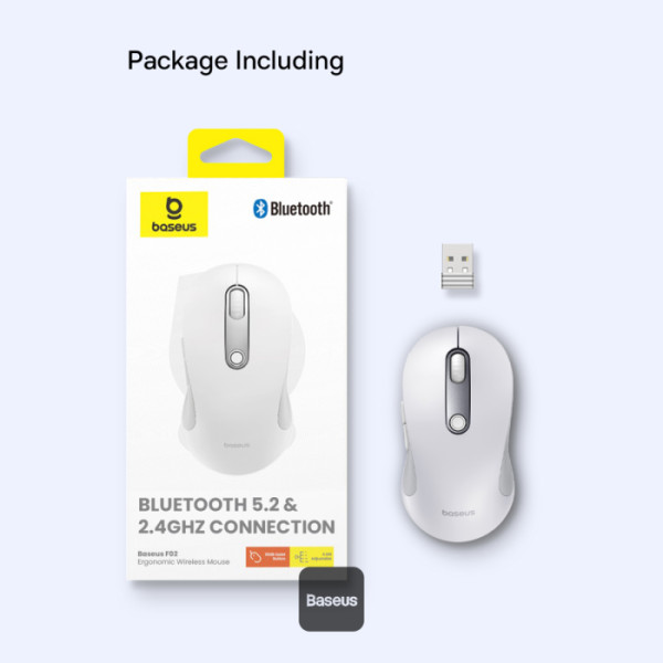 The Baseus F02 Ergonomic Wireless Mouse is built for comfort and versatility. With dual‑mode connectivity (Bluetooth 5.2 and 2.4GHz), it seamlessly switches between devices, making it ideal for professionals who use laptops, desktops, or tablets. Its silent buttons reduce noise to just 30dB, perfect for office or study environments. The five DPI settings (up to 4000) allow precise control for tasks ranging from casual browsing to detailed design work. Lightweight at only 90g, it’s easy to carry and ergonomically shaped to reduce wrist strain during long use. The mouse also features auto‑sleep mode to save battery life and a power indicator for convenience.